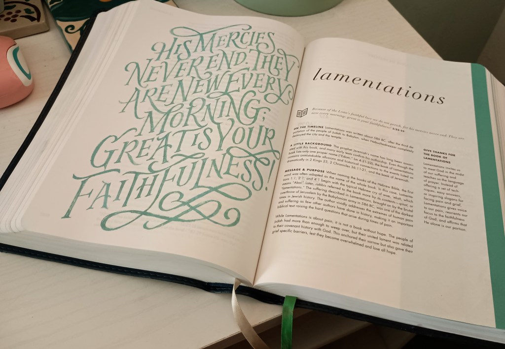 “Yet I call this to mind, and therefore I have hope: Because of the LORD’s faithful love we do not perish, for his mercies never end. They are new every morning; great is your faithfulness!” Lamentations 3:21-23 (CSB; She Reads Truth Bible)